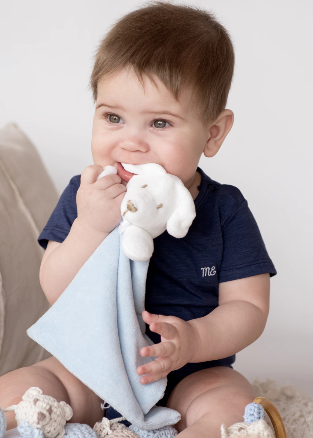 Muñeco de apego para bebé, elaborado en tela suave y segura. Ideal para calmar la ansiedad por separación y acompañar momentos de descanso y juego. Articulo 991195P